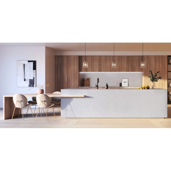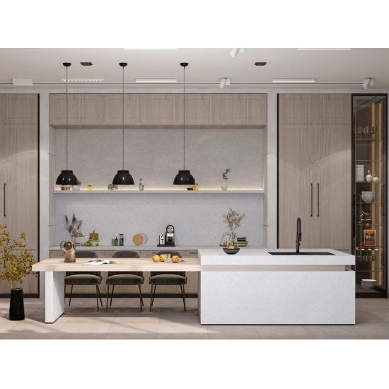 1001 كوارتز أبيض لامع يتميز هذا الكوارتز بمظهر نقيّ ومشرق، بقاعدته البيضاء الناصعة المتداخلة بدقة مع رقائق معدنية متلألئة. يشعّ سطحه أناقةً، إذ يعكس بريقه الخافت الضوء من كل زاوية، مضيفًا إحساسًا بالعمق والرقي. صُمم هذا الكوارتز ليُضفي لمسة جمالية راقية على أي مساحة، مما يجعله مثاليًا لأسطح المطابخ الحديثة، ووحدات الحمام، والأسطح المميزة.