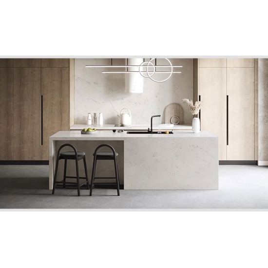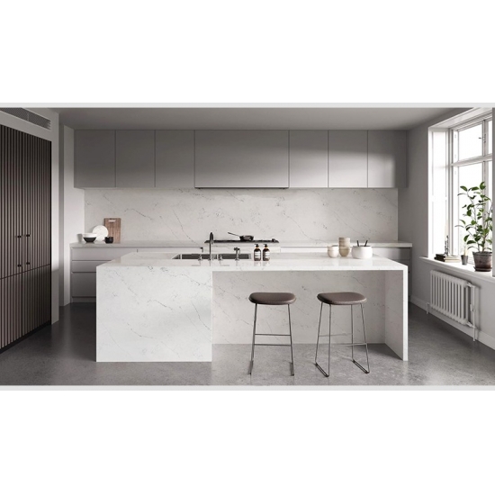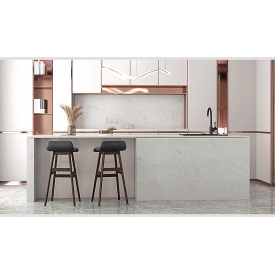 4038 رخام كارارا ستاتاوري كوارتز يتميز هذا الكوارتز بمظهر أنيق وراقي، بخلفية بيضاء ناعمة تتخللها عروق رمادية رقيقة مستوحاة من رخام ستاتاوري الطبيعي. يضفي سطحه لمسة من الرقي الخالد، حيث تنساب العروق الدقيقة بانسيابية على سطحه، مما يخلق إحساسًا بالحركة والعمق. صُمم هذا الكوارتز ليمنح أي مساحة إحساسًا بالفخامة والإشراق، مما يجعله خيارًا مثاليًا للمطابخ والحمامات والمساحات الداخلية السكنية أو التجارية الراقية.