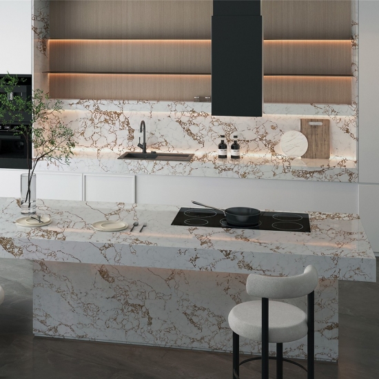 يُبهر كوارتز كالاكاتا، بجماله الفريد، الحواس بلونه الأبيض الناصع وعروقه الرخامية البارزة التي تُضفي عليه مظهرًا رخاميًا خلابًا. يتميز هذا الكوارتز بنمط عروقه العريضة والجميلة، وملمسه الفاخر، ليُقدم المظهر الطبيعي لرخام كالاكاتا، دون أي من عيوب أسطح الرخام. يُعد كوارتز كالاكاتا سطح عمل متينًا للغاية، مقاومًا للبقع والخدوش، مما يجعله خيارًا عمليًا جدًا لأسطح المطابخ والحمامات، والسلالم، وعتبات النوافذ، والأثاث المصمم حسب الطلب، والجدران والأرضيات الداخلية والخارجية، وتقنية القطع المائي، وغيرها من مشاريع التصميم.