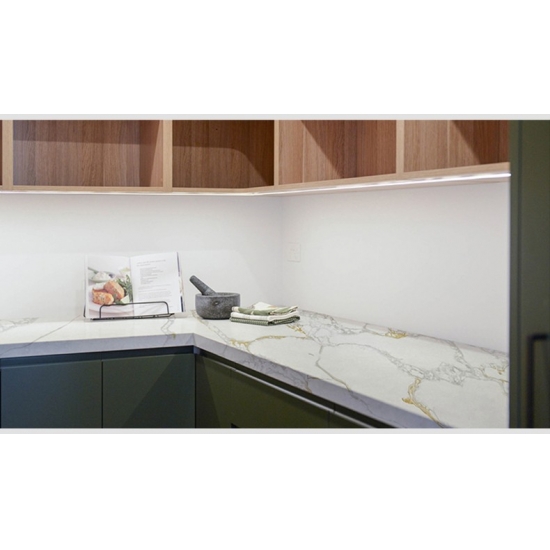 يتميز كوارتز كالاكاتا أوشن 5058 بقاعدة بيضاء لافتة للنظر تتناقض مع عروق رمادية جريئة وجذابة. يخلق التدفق الديناميكي للأنماط إحساسًا بالعمق والحركة، مستحضرًا قوة المحيط. تُضفي هذه القطعة لمسة فاخرة وعصرية، وهي مثالية لتكون نقطة محورية في التصميمات الداخلية المعاصرة.