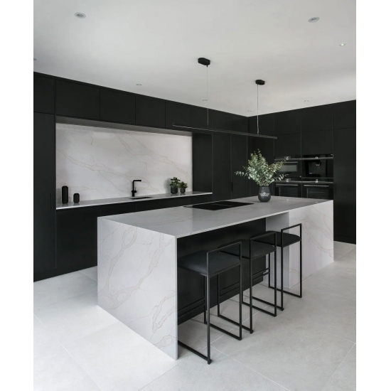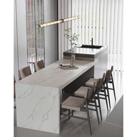 يُعدّ كوارتز كالاكاتا فيرونا 5063، الخالي من السيليكا، خيارًا صحيًا ومستدامًا للأسطح، لا سيما في المطابخ والحمامات. فتركيبته الخالية من السيليكا تجعله أكثر أمانًا عند التركيب، وتقلل من المخاطر الصحية المرتبطة بالتعرض لغبار السيليكا. تضفي عروق كالاكاتا الأنيقة مظهرًا فاخرًا يُشبه الرخام، بينما يضمن سطحه المتين غير المسامي مقاومة للبقع والخدوش والحرارة. وهذا ما يجعله خيارًا ممتازًا للمناطق ذات الحركة الكثيفة، إذ يجمع بين الجمال والأمان وسهولة الصيانة.