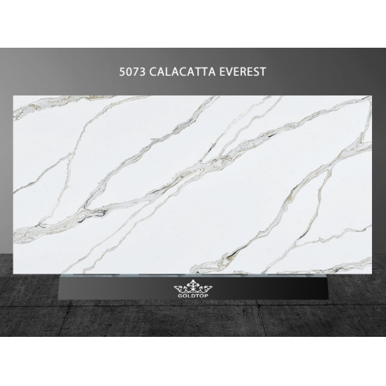 لوح كوارتز كالاكاتا إيفرست رقم 5073 يتميز بسطح أبيض ناصع تتخلله عروق رمادية بارزة. يخلق هذا التباين القوي تأثيراً بصرياً ديناميكياً وفخماً. يجسد هذا اللوح أناقةً مهيبة، مما يجعله مثالياً لإضفاء لمسة راقية على أي تصميم داخلي عصري.