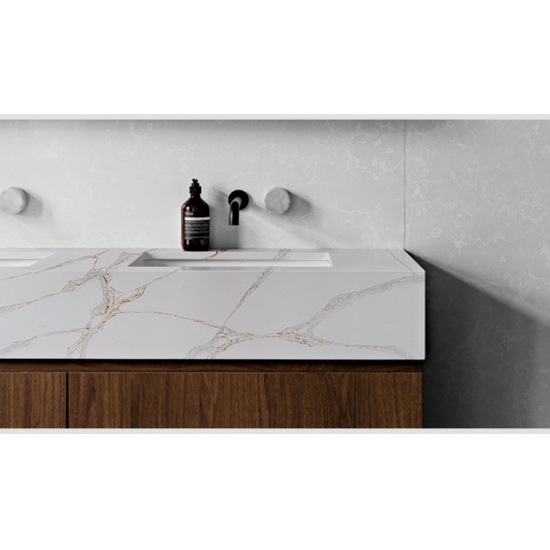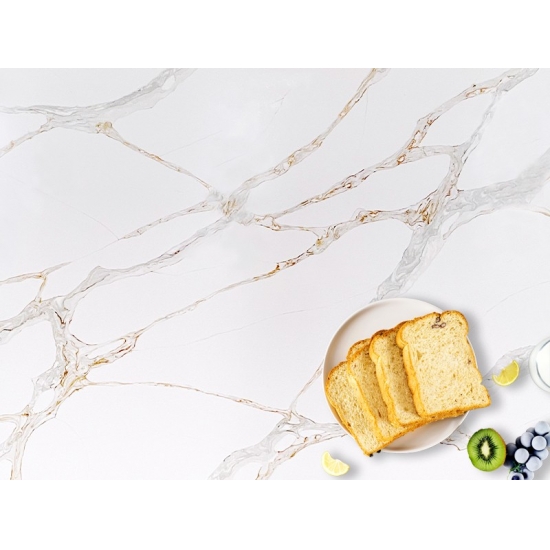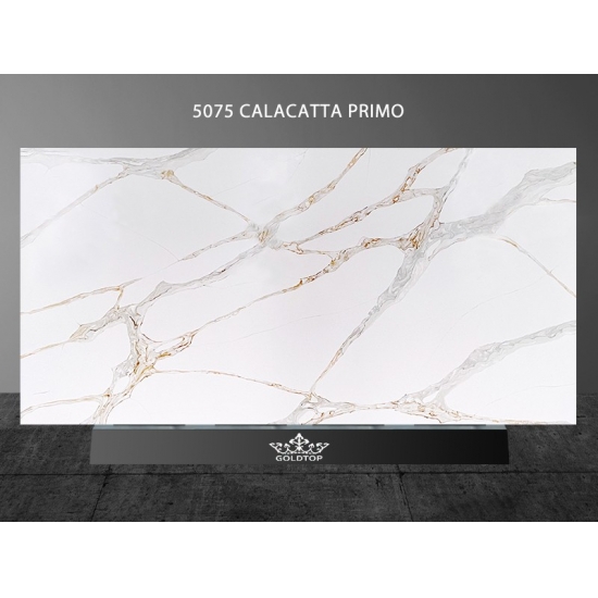 لوح كوارتز كالاكاتا بريمو 5075 يتميز بسطح أبيض ناصع معزز بعروق جريئة وجذابة بدرجات الرمادي. يخلق هذا التباين الواضح تأثيراً بصرياً فخماً وقوياً. يجسد هذا اللوح الفخامة العصرية، مما يجعله قطعة مميزة مثالية للمطابخ والحمامات المعاصرة، ويرتقي بالمكان على الفور بأناقته الواثقة.