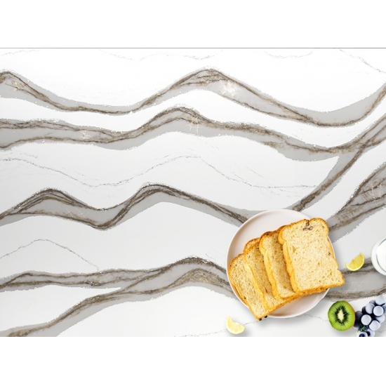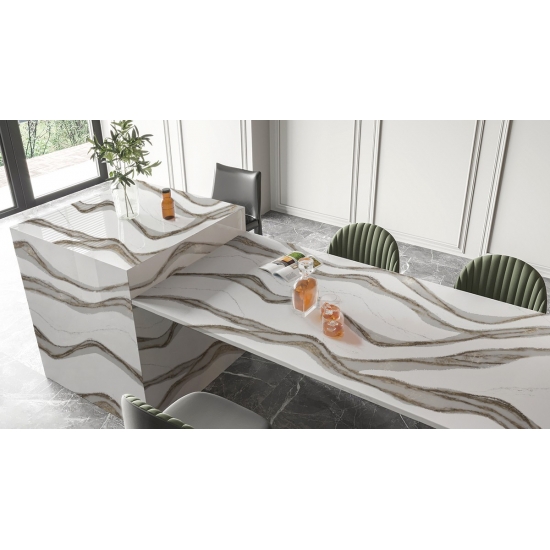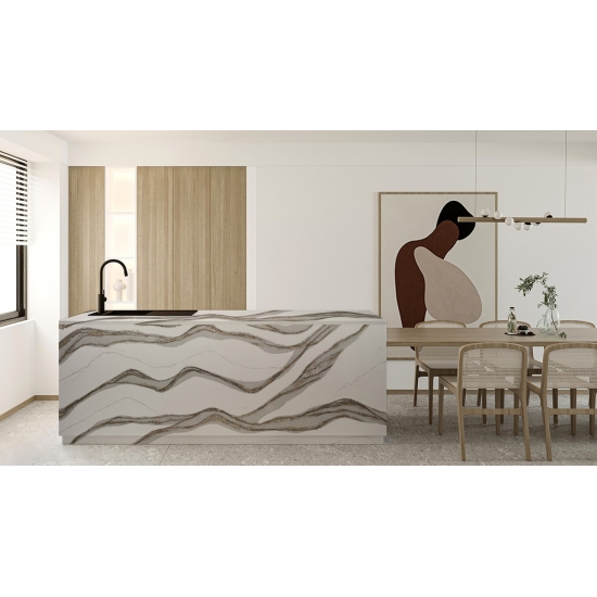 كوارتز سكارا ديليكاتو 5081 حجرٌ فاخرٌ ينضح بالأناقة بفضل خلفيته البيضاء الناعمة، والمزينة بعروق رمادية دقيقة. هذا التصميم مستوحى من جمال الرخام الطبيعي الخالد، ولكنه يتميز بمتانة الكوارتز العالية وسهولة صيانته. تنساب العروق الرقيقة بسلاسة على السطح، مضيفةً لمسةً من الرقي إلى أي مكان.
