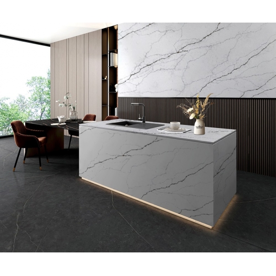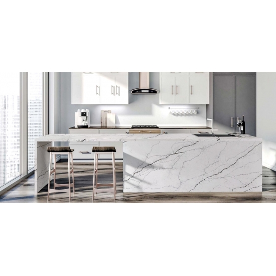 يُبهر كوارتز كالاكاتا، بجماله الفريد، الحواس بلونه الأبيض الناصع وعروقه الرخامية البارزة التي تُضفي عليه مظهرًا رخاميًا خلابًا. يتميز هذا الكوارتز بنمط عروقه العريضة والجميلة، وملمسه الفاخر، ليُقدم المظهر الطبيعي لرخام كالاكاتا، دون أي من عيوب أسطح الرخام. يُعد كوارتز كالاكاتا سطح عمل متينًا للغاية، مقاومًا للبقع والخدوش، مما يجعله خيارًا عمليًا جدًا لأسطح المطابخ والحمامات، والسلالم، وعتبات النوافذ، والأثاث المصمم حسب الطلب، والجدران والأرضيات الداخلية والخارجية، وتقنية القطع المائي، وغيرها من مشاريع التصميم.