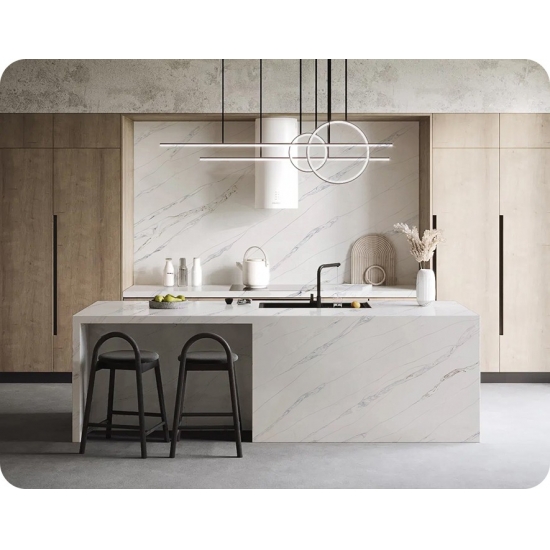 يُعدّ كوارتز كالاكاتا حاليًا المنتج الأكثر رواجًا بين أنواع الكوارتز. يتميز كوارتز كالاكاتا بجماله الفريد، حيث يُبهر الحواس بلونه الأبيض الناصع وعروقه الرخامية البارزة التي تُضفي عليه مظهرًا رخاميًا. بفضل عروقه العريضة الجميلة وملمسه الفاخر، يُقدّم هذا الكوارتز المظهر الطبيعي لرخام كالاكاتا، دون أي من عيوب أسطح الرخام. يتميز كوارتز كالاكاتا بمتانته العالية ومقاومته للبقع والخدوش، مما يجعله خيارًا عمليًا للغاية لأسطح المطابخ والحمامات، والسلالم، وعتبات النوافذ، والأثاث المصمم حسب الطلب، والجدران والأرضيات الداخلية والخارجية، وتقنية القطع بالماء، وغيرها من مشاريع التصميم.