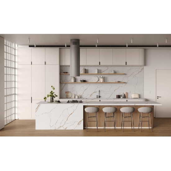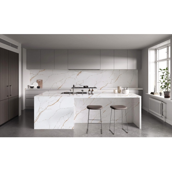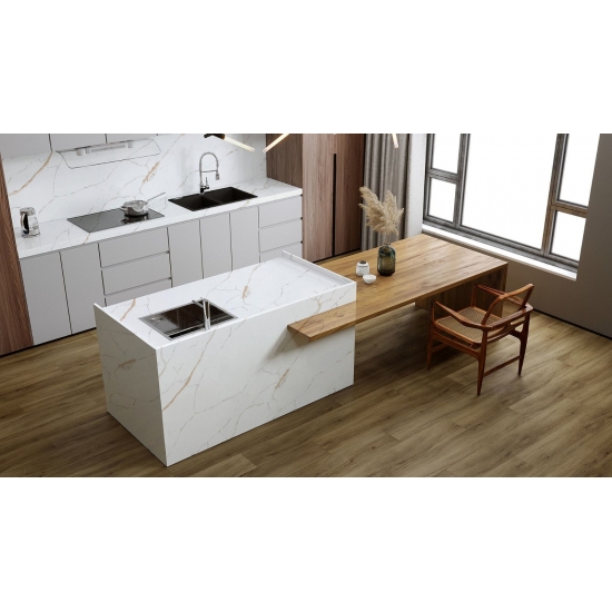 يُبهر كوارتز كالاكاتا، بجماله الفريد، الحواس بلونه الأبيض الناصع وعروقه الرخامية البارزة التي تُضفي عليه مظهرًا رخاميًا خلابًا. يتميز هذا الكوارتز بنمط عروقه العريضة والجميلة، وملمسه الفاخر، ليُقدم المظهر الطبيعي لرخام كالاكاتا، دون أي من عيوب أسطح الرخام. يُعد كوارتز كالاكاتا سطح عمل متينًا للغاية، مقاومًا للبقع والخدوش، مما يجعله خيارًا عمليًا جدًا لأسطح المطابخ والحمامات، والسلالم، وعتبات النوافذ، والأثاث المصمم حسب الطلب، والجدران والأرضيات الداخلية والخارجية، وتقنية القطع المائي، وغيرها من مشاريع التصميم.