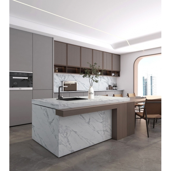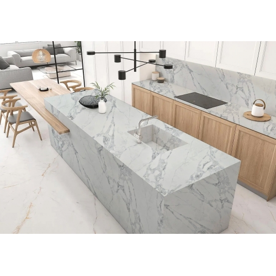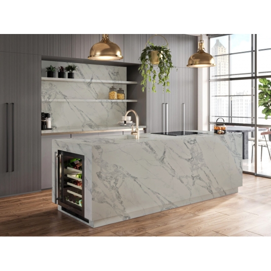 يُبهر كوارتز كالاكاتا، بجماله الفريد، الحواس بلونه الأبيض الناصع وعروقه الرخامية البارزة التي تُضفي عليه مظهرًا رخاميًا خلابًا. يتميز هذا الكوارتز بنمط عروقه العريضة والجميلة، وملمسه الفاخر، ليُقدم المظهر الطبيعي لرخام كالاكاتا، دون أي من عيوب أسطح الرخام. يُعد كوارتز كالاكاتا سطح عمل متينًا للغاية، مقاومًا للبقع والخدوش، مما يجعله خيارًا عمليًا جدًا لأسطح المطابخ والحمامات، والسلالم، وعتبات النوافذ، والأثاث المصمم حسب الطلب، والجدران والأرضيات الداخلية والخارجية، وتقنية القطع المائي، وغيرها من مشاريع التصميم.