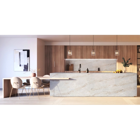 يُبهر كوارتز كالاكاتا، بجماله الفريد، الحواس بلونه الأبيض الناصع وعروقه الرخامية البارزة التي تُضفي عليه مظهرًا رخاميًا خلابًا. يتميز هذا الكوارتز بنمط عروقه العريضة والجميلة، وملمسه الفاخر، ليُقدم المظهر الطبيعي لرخام كالاكاتا، دون أي من عيوب أسطح الرخام. يُعد كوارتز كالاكاتا سطح عمل متينًا للغاية، مقاومًا للبقع والخدوش، مما يجعله خيارًا عمليًا جدًا لأسطح المطابخ والحمامات، والسلالم، وعتبات النوافذ، والأثاث المصمم حسب الطلب، والجدران والأرضيات الداخلية والخارجية، وتقنية القطع المائي، وغيرها من مشاريع التصميم.