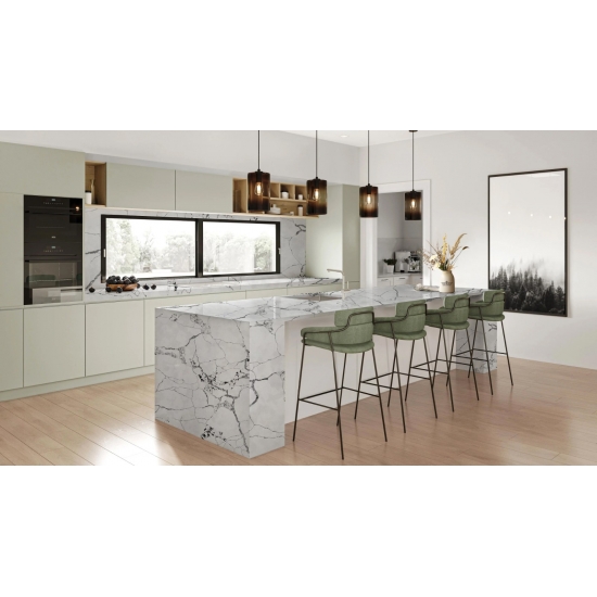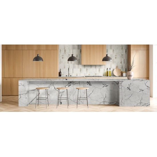 كوارتز أبيض إسمنتي بنقشة ندفة الثلج هو حجر كوارتز صناعي معالج خصيصًا. يشبه في مظهره اللمسة النهائية غير اللامعة، حيث تُغير اللمسة النهائية الخرسانية لون الكوارتز قليلاً مقارنةً باللمسة النهائية المصقولة الكلاسيكية. يُشار إلى هذه اللمسة النهائية أيضًا باسم "المصقول" عند الحديث عن الجرانيت.