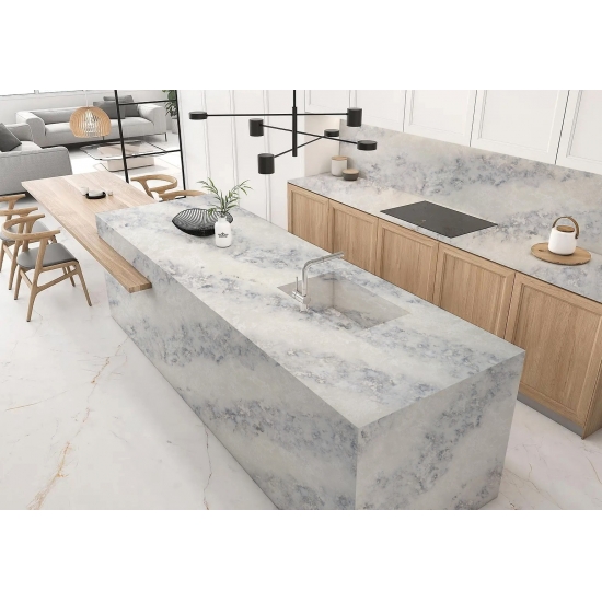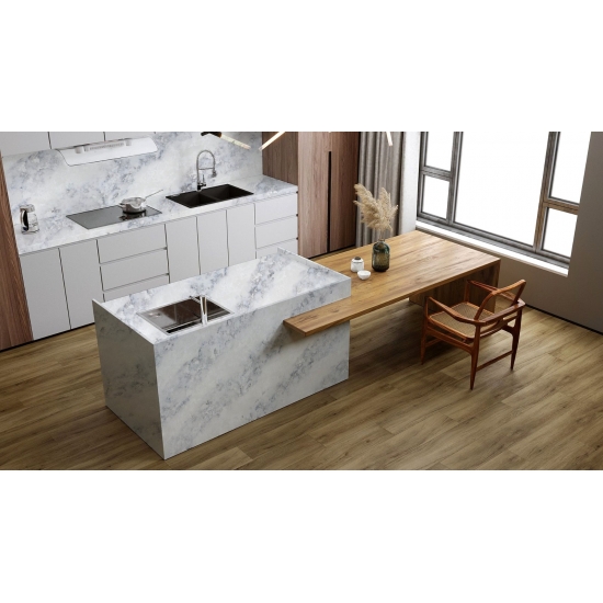 كوارتز أبيض إسمنتي بنقشة ندفة الثلج هو حجر كوارتز صناعي معالج خصيصًا. يشبه في مظهره اللمسة النهائية غير اللامعة، حيث تُغير اللمسة النهائية الخرسانية لون الكوارتز قليلاً مقارنةً باللمسة النهائية المصقولة الكلاسيكية. يُشار إلى هذه اللمسة النهائية أيضًا باسم "المصقول" عند الحديث عن الجرانيت.