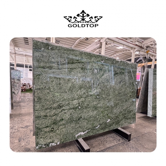 الكوارتزيت الأخضر الزمردي مع خلفية خضراء متناغمة وإبرازات صفراء بيضاء مذهلة، يعد الكوارتزيت الزمردي اسمًا مناسبًا لحجر الكوارتزيت الجميل من البرازيل.